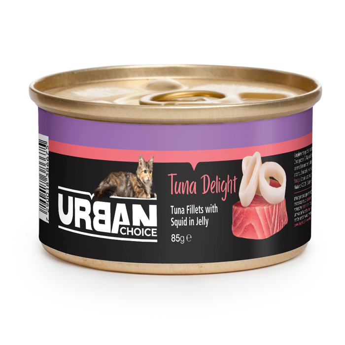 אורבן צ’ויס URBAN choice מעדן לחתולים בטעם טונה וקלמארי 85 גרם