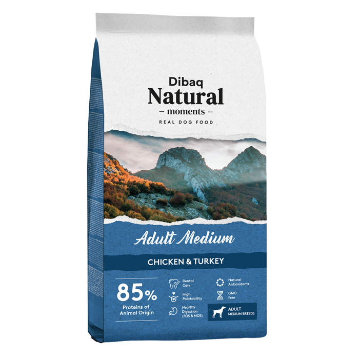 Dibaq Natural Moments Adult Medium מזון לכלבים בוגרים מהגזע הבינוני עם עד 85% חלבון מן החי. עשוי עם עוף, הודו, צמחים טבעיים (אורגנו, רומרו, עגבנייה, ולריאן, מטריריה, מליסה, תפוז מר ואלקצ'ופה), תמצית יוקה לנטרול ריחות, פרוביוטיקה ונוגדי חמצון טבעיים.